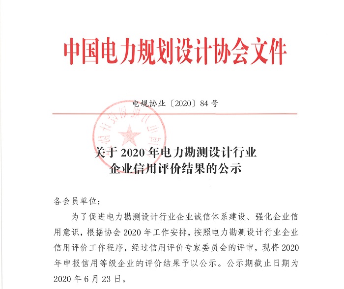 近日,中國電力規(guī)劃設(shè)計協(xié)會下發(fā)《關(guān)于2020年電力勘測設(shè)計行業(yè)企業(yè)信用評價結(jié)果公示》(電規(guī)協(xié)業(yè)[2020]84號)文件,我公司在首次參報的“2020年電力勘測設(shè)計企業(yè)行業(yè)信用評價”中,榮獲AA級信用評價等級,可喜可賀!